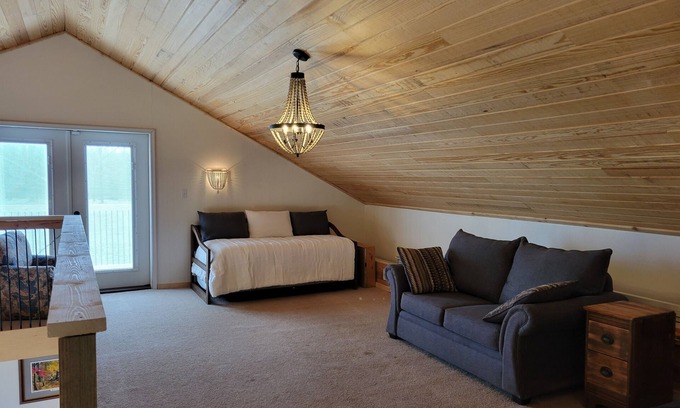 Your Ozark retreat awaits at this 8 bed home, just 5 miles from local shopping. Current and Big Piney Rivers are both nearby. Each sleeping space is unique, and easily hosts 4 couples plus a few others. Nestled in a tranquil setting, this property is perfect for guests seeking a peaceful escape. Relax on the balcony with a good book. Watch the kids play lawn games while you grill. Chill by the fire ring with some s'mores. Or take a scenic hike through the back 40. Make your getaway one for the books with a stay at our place.