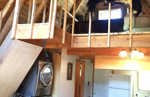 This is an Aframe cabin with one queen sized bed and an open upstairs bedroom loft. The bed is located in the loft and requires climbing stairs.