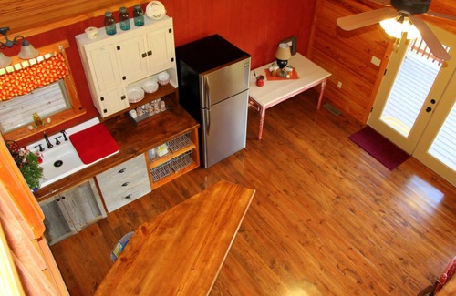 Chimney Mill Cabin is named for the old grist mill that once stood at Kings River Falls. The cabin will accommodate 8 overnight guests in 2 king beds, 1 queen bed, 1 futon bed, and 2 and 1/2 baths. It features a fully equipped kitchen, large farm table in dining area seats 10, second table seats 4, kitchen island seats 4, electric fireplace, Dish Satellite Service, and wrap-around porch (the south side is screened in). Wrap-around porch has several chairs and tables that allows one to sit and enjoy the wildlife and listen to the river. The cabin is only a few feet from Kings River close to the Buffalo National River Area and many well-known hiking trails. This is the perfect place for hikers to enjoy the popular hiking trails in this area.