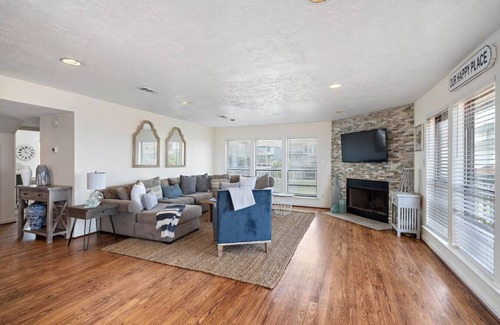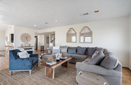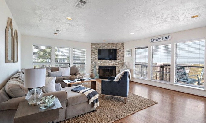 Step through the door and climb the stairs to discover the inviting main living space. A plush sectional sofa with throw pillows faces a mounted flat-screen TV, perfect for movie nights or afternoon naps. Warm light fills the room from expansive windows showcasing breathtaking ocean views. Nautical touches and recessed lighting complete the coastal ambiance. Slip off your flip-flops and sink into comfort!