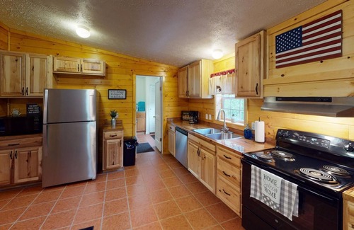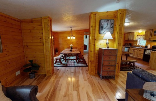 Guests will enter an inviting space that makes you feel like you are home away from home. The knotty pine walls, hardwood flooring, and wooden accents make you feel warm and comfortable. The open-concept layout makes it easy to entertain guests. The lodge comes with a fully equipped kitchen, dining area, and living room. There are 4 bedrooms for guests to rest for a day of fun.