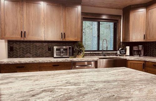 The ground level of this three story cabin features a living room, dining area and a full kitchen with beautiful cabinets and granite countertops. Past the kitchen at the end of the hall on the lefthand side is the master bedroom with a king sized bed and an attached private bathroom that features a walk-in shower. The master suite also has a private entrance to the back deck and hot tub. At the end of the hall to the righthand side you'll find the mudroom with a half bath and access to the back deck.