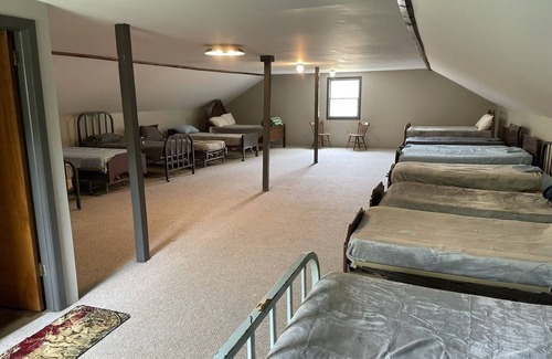 An open and cozy upstairs features 10 twin beds, 4 double beds and a bathroom. The first floor features a fully stocked kitchen, large dining area with plenty of seating, a living room with a pull-out couch, deck with wrap-around bench seating, and second bathroom. Bedding and linen are provided.