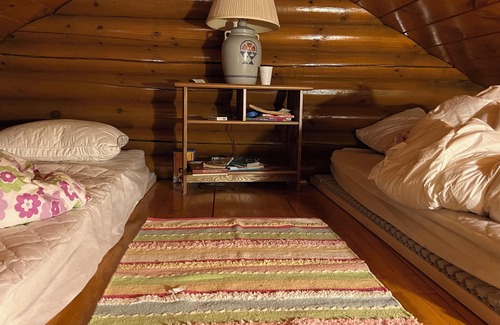 The main log cabin with a big porch sits near the lake. The cabin can sleep 6. Nearby is a bunkhouse that can sleep 6 in bunk beds.