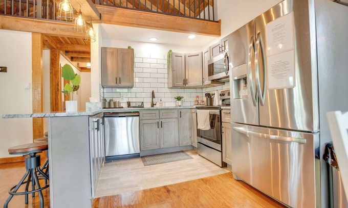 Inside, the cabin offers an open layout with a sleeping Loft, a full kitchen, a cozy living space with 2 sofas and a recliner, a flat screen tv, and an electric fireplace.