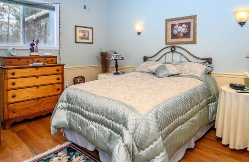 Cozy cabin with open layout and decorated with an artistic eye. Tranquil bit of woods will make you forget that you are just a short 10 minute drive from Town and all of the amenities you will need for your stay.