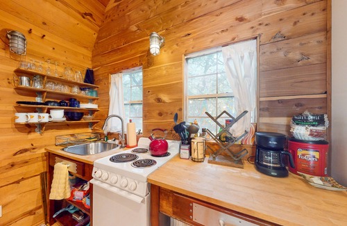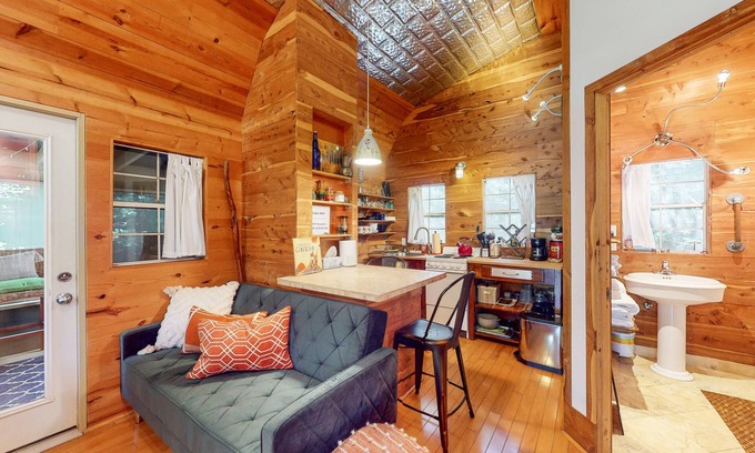 Enjoy a feeling of tucked-away seclusion at this studio cabin-style home in Austin. There’s sleeping space for four guests between a full-size bed in a lofted area and two daybeds on the main floor. A well-equipped kitchenette offers essential appliances for easy meal prep, and a screened porch provides extra space and privacy.