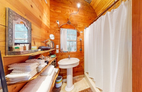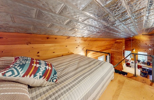A lofted area on the second floor offers a full-size bed. The full bathroom has copper accents, plush linens, and a single shower.