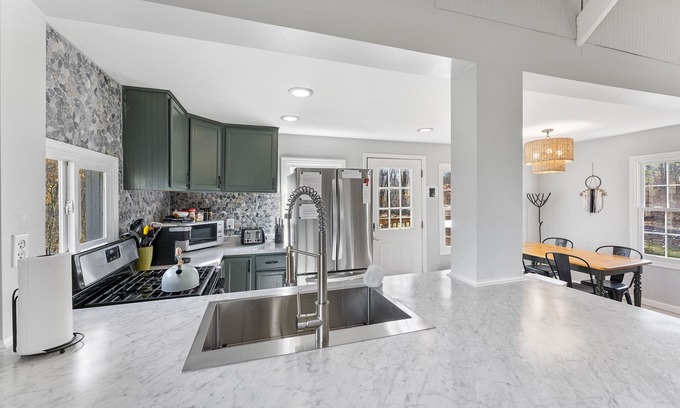 The kids will enjoy riding bikes up and down the large driveway, exploring the woods (including a path down to the stream), and having s'mores on the fire. There's plenty of room to run around.