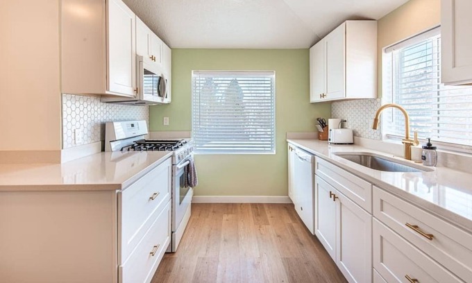 • has a Keurig machine, toaster, stove, oven, microwave, and dishwasher