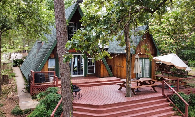 This beautiful A Frame is on a protected cove and nestled right in the middle of the Angelina National Forest on a secluded peninsula (six miles down Forest Service Roads) and right on gorgeous Lake Sam Rayburn. This spacious retreat sits on over an acre on a protected cove where you can fish and ski all day long. Boats can safely be kept in the water on a floating dock.