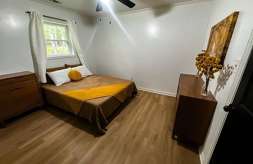 Secluded dog-friendly cabin with updated interior, firepit, games, W/D, and AC is located in Chattahoochee Hills. Secluded dog-friendly cabin with updated interior, firepit, games, W/D, and AC provides accommodation, featuring Laundry, Entertainment, Barbecue/Outdoor Cooking, among other amenities. This Cabin features Laundry, Entertainment, Barbecue/Outdoor Cooking, to make your stay a comfortable one.