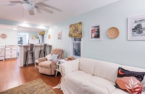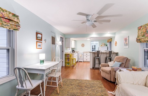 INDOOR LIVING: Flat-screen TV, dining table, breakfast bar, walk-in shower, ceiling fan (living room), books, puzzles