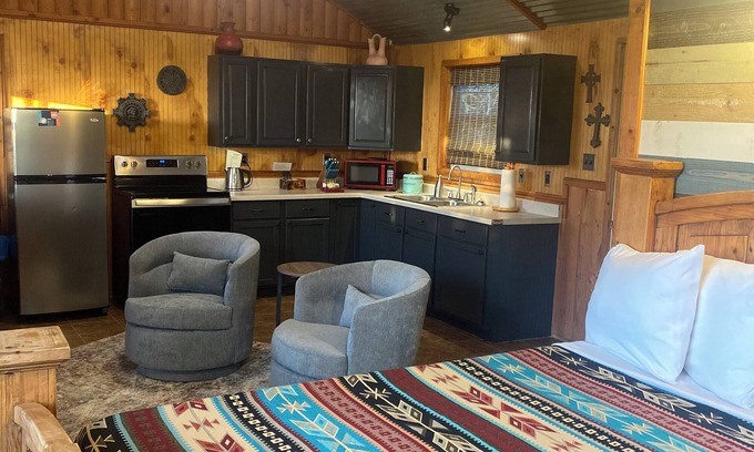 Guests love the solitude and scenery, as well as the added amenities like a charcoal grill, chiminea, free Wifi/smart tv and access to the ranch’s shared swimming pool, fishing pond, hiking trails, and game room. Wildlife is abundant here—you might spot deer, wild turkeys, or even the ranch’s resident buffalo while enjoying a walk or simply relaxing. Whether you're celebrating a special occasion or just craving some quiet time away from the city, the Hacienda Cabin delivers the ideal mix of adventure, relaxation, and romance. Located between Glen Rose and Stephenville, it’s a perfect home base to explore the area—or stay put and let nature be your entertainment.
