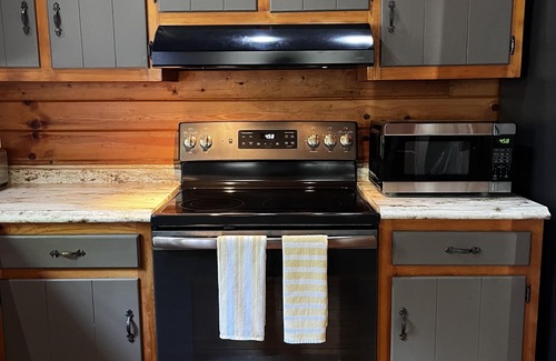 The cabin is quaint, isolated and beautiful. There are 3 bedrooms, 2 bathrooms, 2 living rooms, tvs in each bedroom and living room, wraparound porch with a grill and plenty of parking. The dining area has a very large dining table with room for 10 people. The kitchen is supplied with everything you may need. The main bedroom has it's own full bathroom, walk in closet, and living room with a recliner and pull out couch. The main living room has electric sofa and an electric recliner plus an additional recliner. The second bedroom has a queen bed. The third bedroom/office has a trundle bed (2 twins) that is set up as a day bed plus a desk/work area. There is a wrap around porch with seating and a grill which overlooks the very large yard.