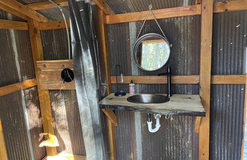 There are lights inside and outside, as well as fans, a portable A/C and/or heater. While these amenities are a great addition, please be mindful of your usage as the hot water supply for the shower is limited, and the solar batteries will eventually run out of energy. However, we have found that thoughtful usage will provide sufficient power and light each day.