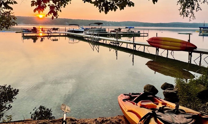 The Guest Cottage shares the 3-acre property with the Family Cottage which is located through the forest about 90’ away. No roads intersect the area between the cottages and the lakefront. Our cottages share 200’ of shore front; two swim rafts and a large, gorgeous dock offering plenty of room for you to enjoy the beautiful sunrises & a slip to moor your own boat. At the water’s edge a lounge deck with table and chairs and a small sandy beach area for children awaits you, your family & friends. Each cottage has its own tandem kayak & campfire pit to enjoy. The lake bottom is sandy with a gradual slope from the end of the dock outward.