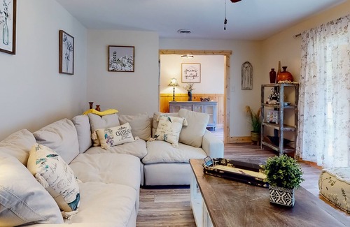 Inside, you’ll find a bright space that features all the comforts of home. Highlights include multiple living spaces, a natural river rock fireplace in the living room downstairs, a wet bar, plentiful natural wood accents, and upgraded flooring. Hardwood cabinetry and stainless steel appliances shine in the full kitchen, complete with an array of gadgets to make cooking a breeze. Enjoy meals inside or out on the patio next to the built-in grilling station. After the day's adventures, relax in air-conditioned comfort or get cozy in front of the fireplace while streaming your favorite shows. Even better, gather around the wood-burning fireplace outside for some quiet conversation and a bottle of wine from a nearby vineyard. Four well-appointed bedrooms offer a restful night’s sleep. With additional perks including free WiFi and a private washer/dryer, the only question left is how many extra days to book!