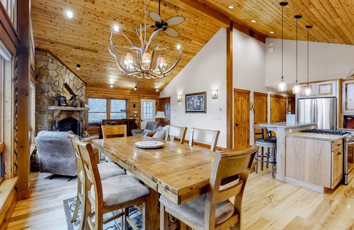 Reserve your stay on the second floor of this cabin whose deck overlooks the nearby lake and mountains! This secluded home features rich furnishings and high-end appliances, as well as plenty of natural light. The magnificent stone hearth is home to a wood fireplace, keeping everybody cozy after a day of skiing.