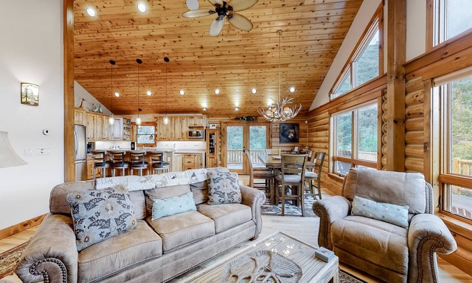 Natural light floods the beautifully furnished living room, and a full kitchen sets the scene for meals in. The dining table seats six, and four more can sit at the breakfast bar. Up to six guests can stay in this beautifully outfitted cabin, and four can sleep comfortably in the two bedrooms. This rental is a part of a larger home that can be reserved all together for bigger groups, just contact Vacasa for more information.