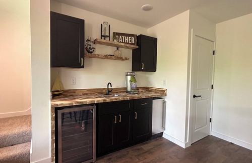 The house interior provides open living areas on each level. Upper level containing 2 bedrooms with Queen beds, 1 full bath, full kitchen with double door fridge, water filter, ice maker, range, oven, microwave, dish washer and all the kitchen amenities of home. In addition, a walk in laundry room is located adjacent to the kitchen space. Just outside the 1st floor living area guests will find an incredible 540 sqft covered deck that wraps the entire backside of the home! Completed with a 110" ceiling fan, oversized outdoor sectional set, dining area & Blackstone grill. Transitioning to the lower level a kitchenette provides guests with a 2nd mini fridge for beverage storage, sink, and best of all, a COMMERCIAL ICE MAKER, capable of producing 50lbs of ice per day! A second living area with TV, Racing simulator & play space for kiddos (or adults) is open for enjoyment. Bedrooms 3 & 4 are located on the lower level and include a Queen, Full and 6 bunk beds split by the full bathroom in between. Additional air mattresses are also available for use by guests. Walkout basement leads to a 2nd covered seating area, Fire pit and well landscaped steps down to the lake. The only thing this home is missing is the wonderful memories you'll make staying here!