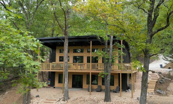 The Paradise Pad: This modern property boasts the ultimate private & waterfront getaway! Completed in 2024, Set on 1.25 acres of the secluded hillsides in Honey Creek Cove. 5 min to Dam Site boat ramp & 15 Minutes to Eureka Springs will allow you to enjoy all Beaver Lake has to offer! 4BR/2B, 2100 sqft home, 1000 sqft in total covered outdoor living, reverse ranch & walkout, lakefront, kayaks provided, easy walk to shoreline/beach area, dual kitchens with commercial ice maker! Separate living areas on each level..