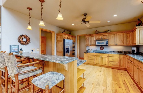 This kitchen is like no other; it's a gourmet kitchen equipped with modern stainless steel appliances and utensils that will make cooking a breeze. Spacious and well-equipped, this kitchen will surely help you channel your inner Jamie Oliver and surprise guests with mouth-watering meals. Right off the kitchen and to your right is another living space with inviting sofas and a recliner. There is a TV equipped with an Amazon Firestick streaming Hulu, or you can catch up on your favorite Netflix series (please, use your own account) thanks to the fast Starlink internet. On this level of the lakefront retreat, you'll find one bedroom with a king bed, an ensuite bathroom, and a half bathroom. Outside, the patio is spacious and offers unparalleled Little Star Lake views. Gather around the firepit after dinner and experience beautiful sunsets while making 'Smores. You'll find two bedrooms on the lower level, each with a queen bed and twin bunks. In the common area is one futon, a day bed with a trundle, and your very own Ping-Pong table. As you climb up the stairs all the way up to the upper level, you'll find two bedrooms, each with king beds and en-suite bathrooms.