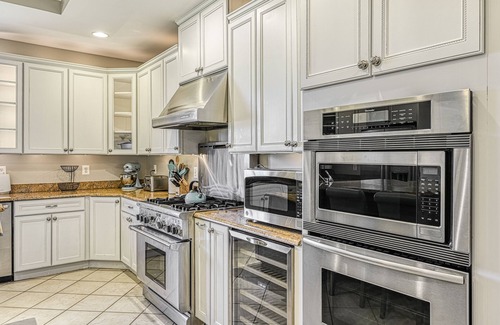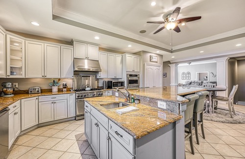 The second floor houses the main living space. Here, guests will find a comfortable living area with another gas fireplace and a smart TV, a gorgeous, formal dining room with a ten-person dining table, a gourmet kitchen with high-end stainless steel appliances, a walk-in pantry, a wine cooler, exotic, hand-selected granite countertops, a four-person island, and a breakfast nook. Children's dinnerware and a booster seat are available for younger guests.