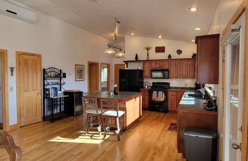 The main area upstairs incorporates large open plan living area with gas fireplace, dining area and spacious kitchen, and cathedral ceiling. The full length windows look out onto the wraparound deck to maximize the breathtaking views. We've recently added air conditioning upstairs. There is a gas barbecue grill on the upper deck. The fully equipped kitchen with Italian porcelain tile counters, granite sink, fridge with ice-maker, second fridge for drinks, smooth top range, and dishwasher is a cook’s dream. The large island has four stools, while the dining area seats six at the dining table.