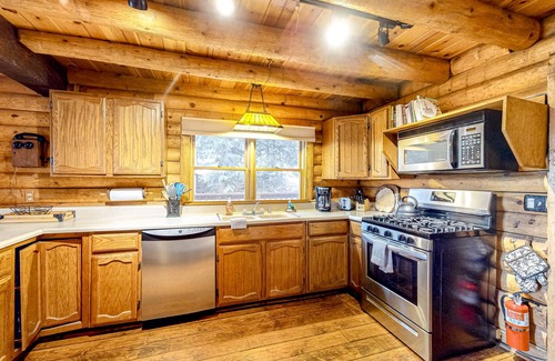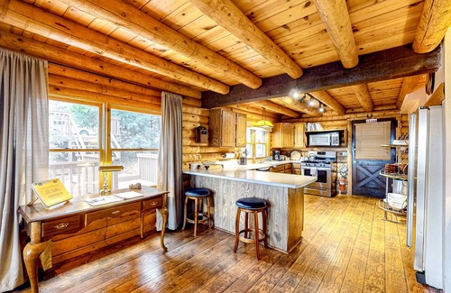 Upon entering this true log cabin, you are greeted by a rustic, wooded interior showcasing exposed wood beams, new laminated wood flooring throughout, and a gorgeous rock wood-burning stove that is in charge of keeping you nice and toasty during the winter months. Spread out comfortably in the welcoming living room and pull out any of the provided board games for a fun evening, or watch an entertaining movie on the TV with a DVD player. A chessboard and a plethora of books are available as well for additional entertainment. The spacious kitchen adds a contemporary touch with modern, all stainless steel appliances and all the essentials needed to prepare exquisite homemade meals for the crew. The extensive, wrap-around deck offers an unbeatable spot to unwind and take in impressive views of mountain blue skies and forest tree tops. Relax in the hammock, host summertime barbecues with the gas grill, dine alfresco, and treat yourself to soothing baths in the private hot tub. All three bedrooms can be found on the upper level. The biggest suite features a reading nook with a small bookshelf and a desk with a monitor and shares a full bathroom with the other two bedrooms.