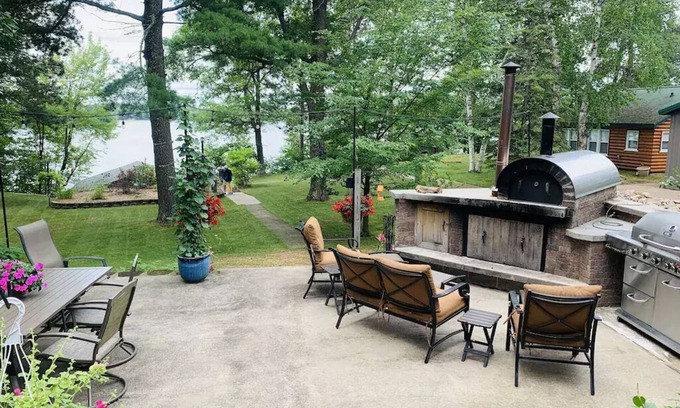 Quiet, woodsy, and stunningly beautiful grounds on a peninsula with a great lakefront with a dock, party deck, and boathouse that serves as a great party room. The property also has its own boat landing to launch your toys. The large patio has a built-in fireplace and an outdoor pizza oven.