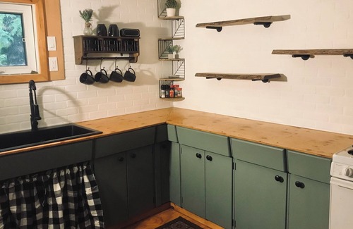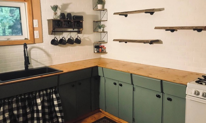 If you’re looking for peace and quiet, look no further! You won’t be disappointed while staying in this secluded, off-grid cabin nestled amongst the trees. This cabin is a one room studio with an open floor plan, boasting a newly remodeled, fully equipped kitchen, queen bed, two twin beds, and a futon for additional sleeping. It also has a large, level backyard, perfect for pitching tents or bringing in a camper for additional guests. The cabin is completely off-grid, offering gravity fed water with on-demand hot water heaters, a newly remodeled primitive bath house with a composting toilet and outdoor shower. The cabin is powered by solar and a very quiet generator. Relax in the morning with a cup of coffee on the covered back porch, or spend your evenings seated around the fire pit with friends and family!