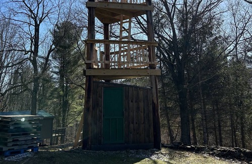 Roughly 600 sq ft. off grid cabin located on 20 acres of pristine meandering woodland. Enjoy the deck overlooking the trees, climb up the 40 foot tower if you're feeling brave or just relax on a hammock looking up into the canopy. Go for a hike in the woods by the creek or sit out by the pond. Enjoy a bonfire in the large bonfire pit, a smaller campfire closer to the cabin at night or enjoy the stars far from any city lights. Cabin has propane powered fridge, oven/stovetop, coffee maker and light fixtures. Solar powered battery provides enough power to charge phones and basic appliances. Get away from the hustle and bustle of civilization. This place has so much to offer you'll never be bored.