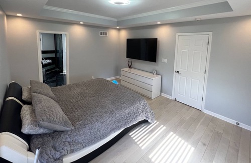 You will love this fully renovated house with a feel of a resort! Marble floors in great room/kitchen/dining room with open floor concept with big screen TV and double oven/microwave and cooktop. All four bedrooms have memory foam mattresses, including the expandable sofa. The futon in finished walkout basement-open floor area with a bar - private full bathroom with jetted tub and jetted shower panel. Built in speakers in basement to watch a movie or play some soothing music- play your playlist from your phone through the AV receiver. Bathroom 3 has jetted shower panel. Primary suite's bath has jetted tub and custom 6-foot shower. Smart TVs in primary suite and great room, and projector with screen and 3 movie chairs in basement. Firepit with stocked firewood outside for relaxing nights. Deck with seating for 10 and fire pit table and barbecue. Patio below with seating for 8 - exit from walkout basement. Fully stocked with silverware, utensils, coffee maker, hair dryers. Only 1 mile from restaurants and few miles from all the action in Prospect and Louisville, KY