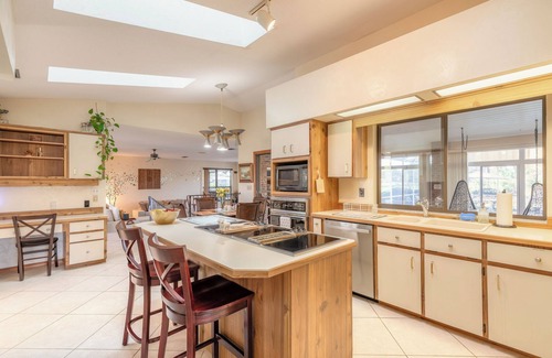 Discover tranquility at our 3BR, 2.5BA retreat in a private fly-in community! Nestled by a scenic golf course, enjoy a backyard oasis with a pond, lagoon-style pool, and hot tub. The primary bedroom opens to a porch overlooking the pond. Entertain with a pool table and smart TVs with Netflix, Hulu, and Amazon. Fridays bring excitement with resident pilots practicing formation flying, creating a dynamic atmosphere. Experience relaxation, recreation, and aviation charm in this exclusive haven.