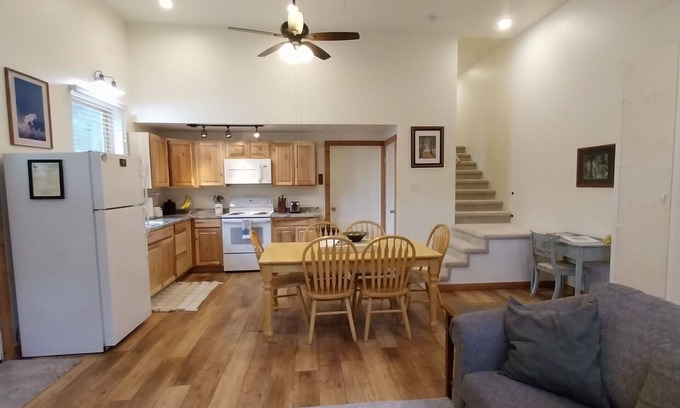 The living room has a loveseat with a pull-out bed (full-size), arm chair and footstools with flat-screen tv with Roku Firestick (bring your app passwords). Internet is also available. There is a desk with chair and the dining table can easily seat 6.