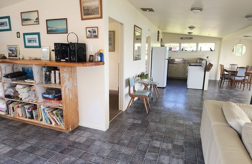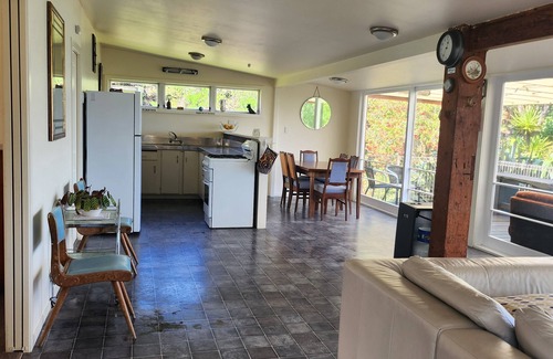 Relax on the deck of Schooner Bay House and soak up the view from the privacy of this comfortable 2-bedroom home. Meet the tui and kaka that visit the bush around the house or the banded rails on the back lawn. Open plan living area. Less than a 5-minute walk to Schooner Bay, great snorkeling and fishing, or go kayaking in 3 complimentary kayaks.