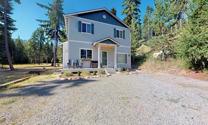 Enjoy the incredible views and fresh mountain air from this secluded retreat in Cle Elum. Powered by solar energy and offering privacy and beautiful nature views through the abundant windows, you'll never want to leave. It also features your own private six acres of land to explore, peekaboo mountain views, roaming elk and deer, and more! This family-friendly home has a comfy indoor fireplace and is ready-made for a couple's getaway or family vacation.