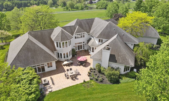 Relax and unwind in the indoor pool or hot tub, or enjoy the entertainment area complete with a piano for added fun. Designed with high-end finishes and modern amenities, this farmhouse provides the ideal setting for a lavish nature getaway.