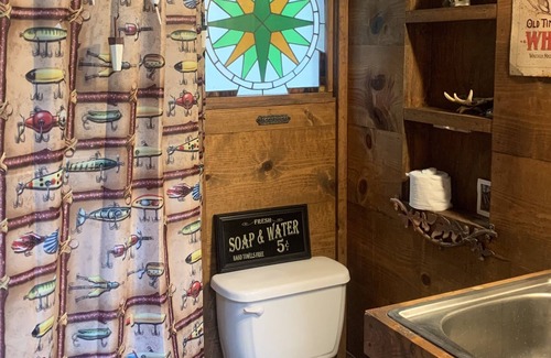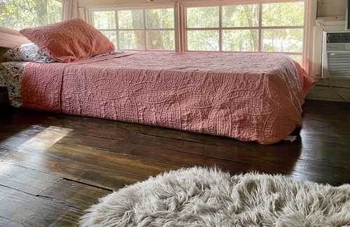 What sets us apart is that you get not one, but two incredible structures for your stay. The 700-square-foot rustic cabin with pecky cypress and native wood interior provides a full kitchen, comfortably accommodating 4-5 guests (note climbing steep stairs to get to the lofts), along with a full bathroom. The ~400-square-foot real Treehouse, crafted by the skilled Treehouse Guys of DIY Network, sleeps up to 3, featuring a small single bed in the upper loft and a cozy queen bed on the main floor. Both spaces are equipped with A/C window units and heaters, ensuring your comfort no matter the season. While this may be a rustic escape in the woods, the cabin offers simplicity and coziness, while the Treehouse provides a unique experience like no other. Please be aware that the Treehouse is not insulated, so it can get a bit chilly during a cold snap, and the sound of rain on the metal roof during storms creates a soothing ambiance. For your convenience, there is an additional full bathroom located outside of the cabin, complete with a newly built outdoor shower that guests absolutely love.