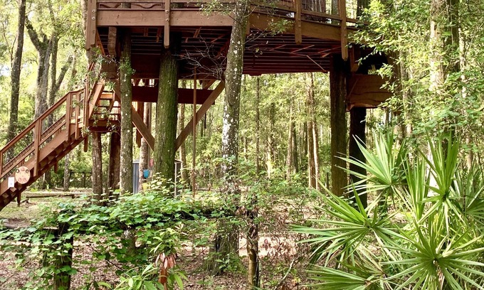 Welcome to The Treehouse Cabin Retreat, where time stands still and nature takes center stage. Nestled in nature based Old Town, Florida, our rustic oasis is your invitation to unplug, unwind, and rediscover the simple joys of life. With no Wi-Fi to distract you, immerse yourself in the great outdoors and rekindle connections with your loved ones. If you're a fan of camping or glamping, this retreat is your dream come true, offering the comforts of home amidst a serene, wooded setting.
