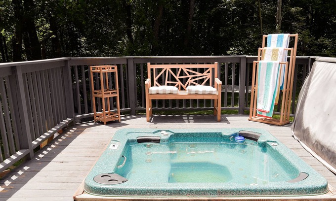 - Backyard oasis with expansive deck, hot tub, grill, hammock, campfire pit, direct access to wooded trails