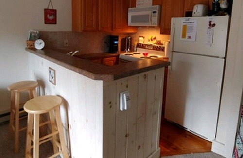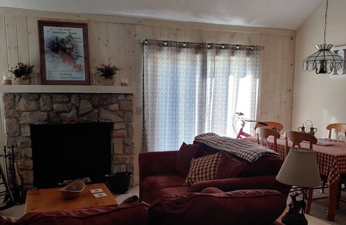 Sit by the fire, relax on the deck at this cozy two Bedroom end unit Townhouse overlooking a backyard pond complete with a calming water fountain in summer months or ice skate on in winter months and relax "On Mountain Time". This rare find features an open concept living/dining area, a brick wood burning fireplace, flat screen TV, cable and WIFI internet. The dining area accommodates 6 and has sliding glass doors that take you to a backyard deck complete with a grill for outdoor cooking where you can dine while enjoying the beautiful pond views.