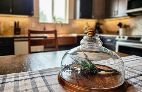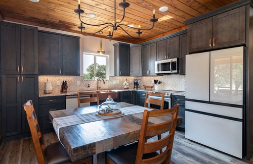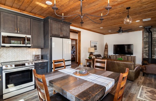 Enjoy the fully stocked kitchen, complete with modern appliances, cookware, and utensils. You'll find everything you need to prepare your favorite meals. A dining area adjacent to the kitchen offers a warm and inviting space to share meals and stories.