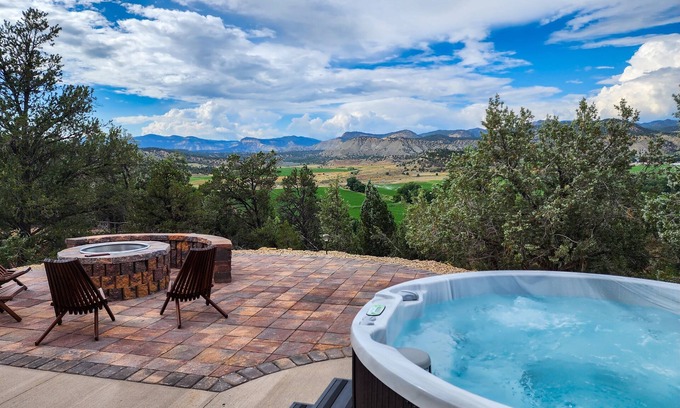 Step outside to the breathtaking view overlooking the valley and Coral Cliffs. The outdoor space features both a wood fire pit and a gas fire pit, allowing you to choose your preferred ambiance for an evening under the stars. The private hot tub offers more than relaxation; it's a front-row seat to the valley's scenic beauty and a clear night's sky. Ease into the warm water, soothe tired muscles, and enjoy the panoramic views, or gaze upwards on a clear night to take in a spectacular stargazing experience.
