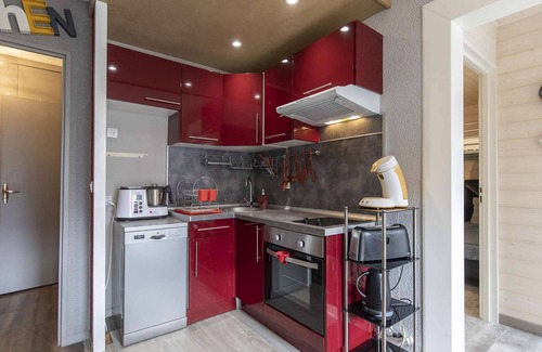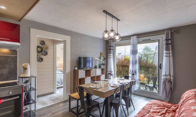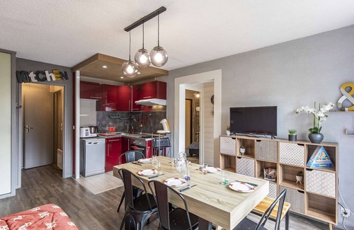 After passing through a first storeroom allowing you to store your hiking or skiing belongings, you will have access to the living room equipped with a table that can accommodate 8 people and a convertible sofa. the bay window offers you a remarkable view of the valley and the mountain range.