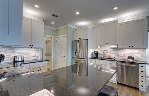 2nd Floor (inside) : Fully Stocked Kitchen with New SS Appliances, Dining Table which seats 6 (plus 2 more at kitchen bar), Leather Triple Reclining Sectional which seats 7 comfortably and a HUGE 75” Flat Screen TV with Playstation 4 (2 controllers & games). This floor also has the Washer/Dryer as well as 1 Bedroom and 1 Bath with Double Bed.