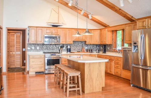 The open concept is perfect for the whole house to gather. The kitchen island and dining room area make hosting a buffet-style extravaganza or wine tasting easy. Seat your guests at the dining table for a more formal setting, and the lake and woodland views add romance. Or spread out on the deck and enjoy the setting sun over the lake on warm evenings. The kitchen has everything you need to satisfy your guests from cocktails to dessert. Gourmands will appreciate the six-burner gas stove and convection oven in the spacious open kitchen finished with hardwood floors. Stream your playlist through the Sonos enabled audio in the Great Room (access instructions next to the closet) to set the perfect mood.