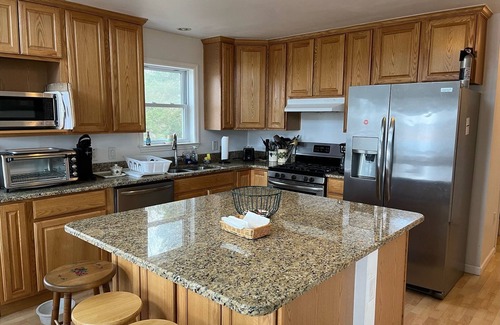 The fully stocked kitchen is ready for the chefs among you and has all the appliances, dishes, cutlery, and glasses you will need. The house has central air conditioning & ceiling fans in all rooms.