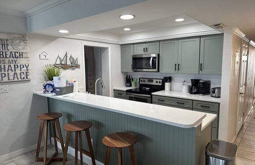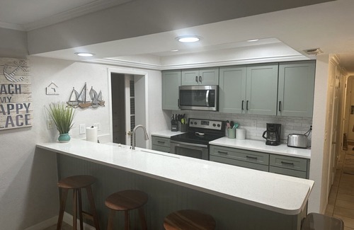 The extras continue! The Newly Renovated Kitchen is FULLY EQUIPPED, which includes ample dishes utensils pots & pans, etc a full size glass-top range and oven, an extra quiet dishwasher, microwave and other small appliances; coffee pot, single cup Keurig, blender, waffle maker, ect. . . The full size refrigerator has an ice-maker. The dining table seats 6 and the adjacent kitchen bar seats 3 additional people.